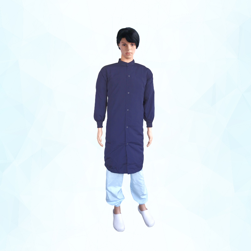 This cleanroom garment features a stand-up collar with Velcro on the overlap and a front snap closure for a secure and professional fit. It includes snap adjustments at the cuffs and offers options for zipper or Velcro front closure. The design provides flexibility with choices of elastic or knit cuffs, 1, 2, or 3 pockets, and raglan sleeves for enhanced comfort and mobility. Made from antistatic grid fabric or 100% polyester, the garment is autoclavable, ensuring durability, safety, and superior contamination control in cleanroom environments.