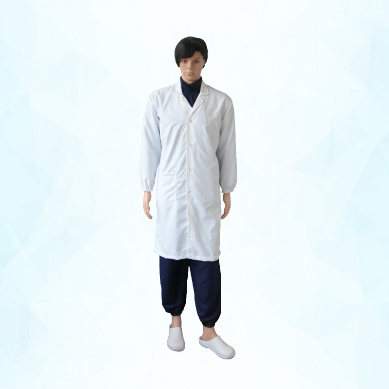 This cleanroom garment features a lapel collar and a front snap closure for a clean, professional appearance. It includes snap adjustments at the cuffs and offers options for zipper or Velcro front closure. The design allows customization with choices of elastic or knit cuffs, 1, 2, or 3 pockets, and raglan sleeves for added comfort and flexibility. Made from antistatic grid fabric or 100% polyester, the garment is autoclavable, providing excellent durability and reliable contamination control in cleanroom environments.
